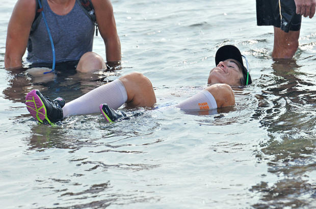 Amber Monforte takes relief from the pain of the final day’s 52.4-mile run with a bath in the salty Pacific after her record setting finish at Ultraman Hawaii.