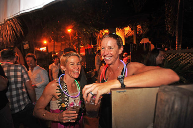 Winner Mirinda Carfrae and third place finisher Julie Dibens share friendship and refreshments at the K-Swiss post-awards party in Kona.
