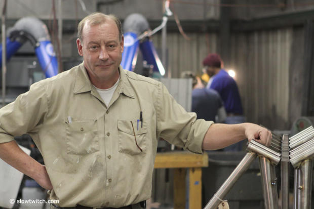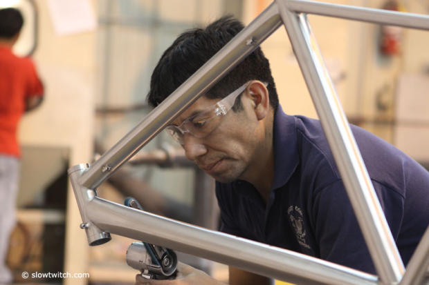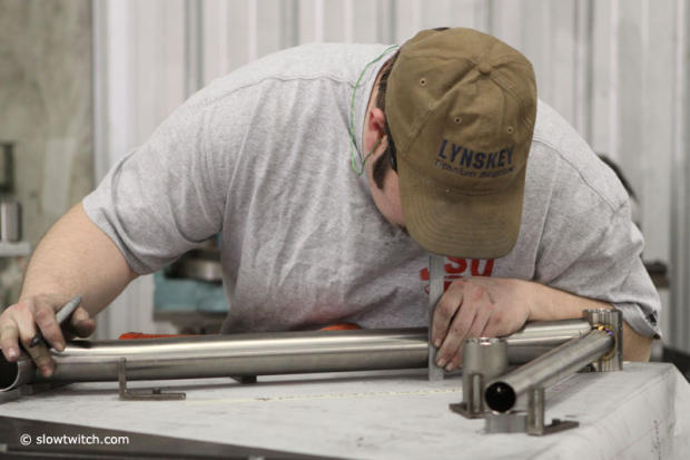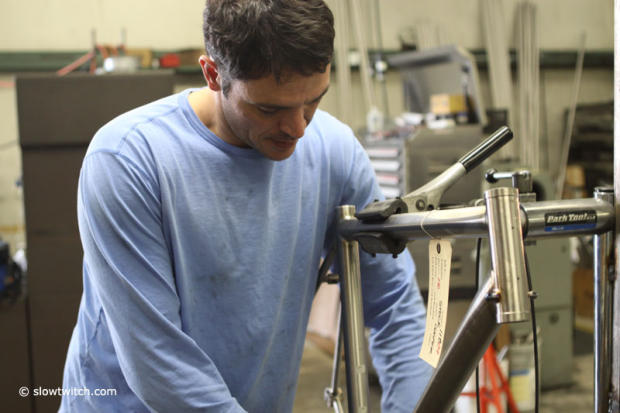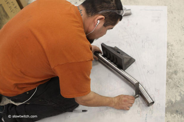 Crouched on the floor, Felix Espinoza is checking out downtube bends for accuracy.