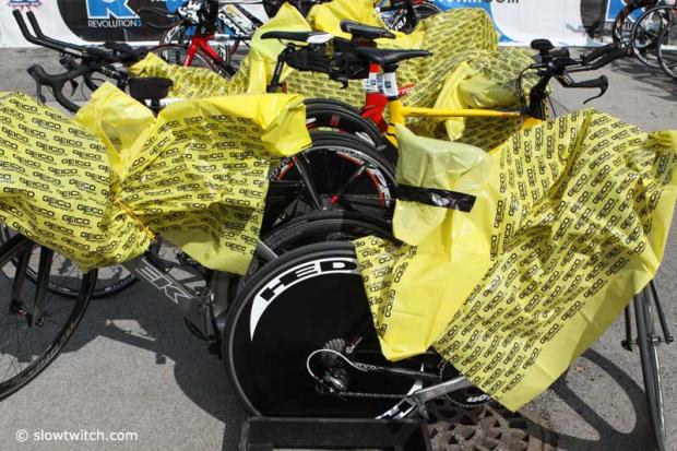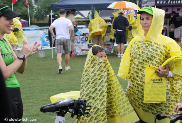 A rain shower made the US Pro Team booth very popular with their sponsor Geico poncho giveaway.