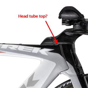 Most bikes have headset top caps above their head tube tops, and then stem clamps that average about 4cm in height. So, the distance from the head tube top to the center of the stem clamp might be, with even just 10mm of spacers, 45mm. The center of the Bontrager aerobar sits about 20mm above what I'm calling its head tube top (see adjacent). Accordingly, I'm going to call the "flat" Speed Concept stem (the lowest height stem) more or less equal to a standard bike with a -25° pitch (a -17° pitch would be a stem parallel to the ground, so, perhaps the lowest-height Speed Concept stem equates to a slightly down-angled stem on a typical bike).