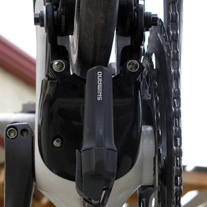This prompted Shimano—from whom I obtained a Di2 TT/tri kit—to send me wiring and harnesses for internal routing; and Trek to send me a couple of items (like a rear brake caliper housing with bosses for the battery mount) specific to this groupkit.
