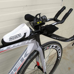 One nice thing about this bike is the water bottle bosses everywhere. I think it's great, and should be a running change on a lot of existing bike models. Especially the bosses on the top tube. I can't imagine it's an engineering problem to drill a pair of holes and epoxy in some nut-certs. I stuck a Profile Design Razor cage and bottle on the top tube and sliced off the trailing end, and put my gels and whatnot in there. Bontrager makes a front Speed Box for this area, but, the Profile bottle worked fine and so would an Arundel bottle. But not a regular round bottle. I tried it, my knees hit.