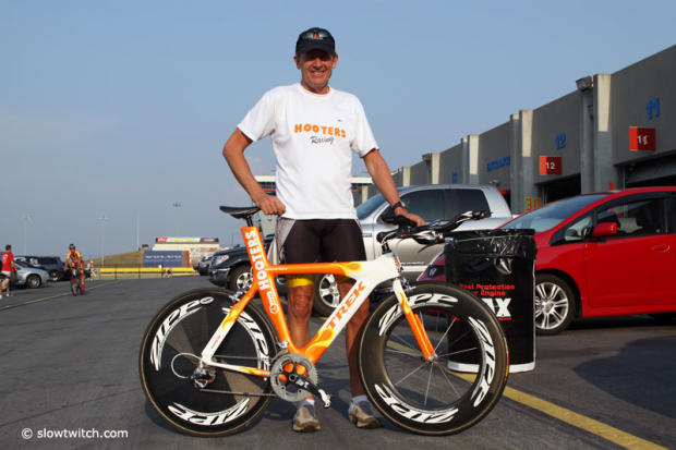 Mark Peterson seems to fit in quite well at the race track here with his Hooters Racing kit.