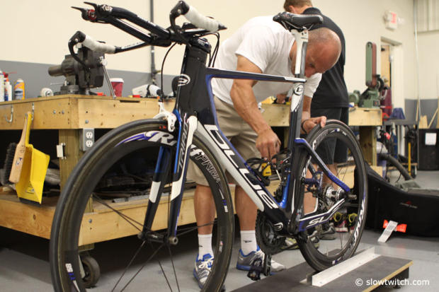 Without the derailleur cable in place Mike Giraud uses this gadget to set up a specific gear.