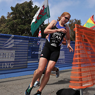 In the women's race, four women streaked to the lead on the swim and bike and then played a triathletic game of Four Little Indians on the way to the finish. After a 21:10-21:22 swim and a 1:07:50 or thereabouts bike, Lisa Marangon of Australia, 2008 Olympian Julie Ertel, recent Monroe, Washington 2nd place finisher Kaitlin Shiver and the West Virginia Mountaineer NCAA runner from Calgary took off together well ahead of the 24-woman field. First to drop was Marangon in the first mile. Second to go was Ertel, the former Olympian who is now a dedicated mother of 19-month-old twins. It seems that one run and one bike a week is enough to keep a mother healthy but not enough to stick with the 24/7 training crowd more than 3 and a half miles.