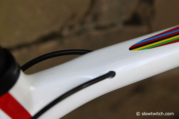 FSA SLK Light 36-46 cranks and an Ultegra front derailleur in the center of the bike.