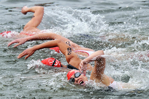 Kate McIlroy (15) of New Zealand, Aileen Morrison of Ireland (56)and Danne Boterenbrood of the Netherlands (17) exit the swim.