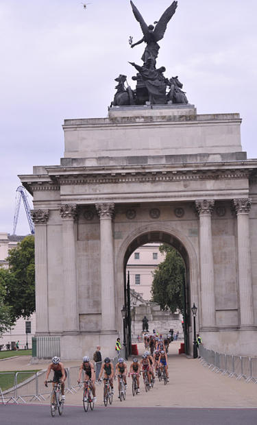 Women's bike pack passes through the Wellington Arch at the edge of Hyde Park.