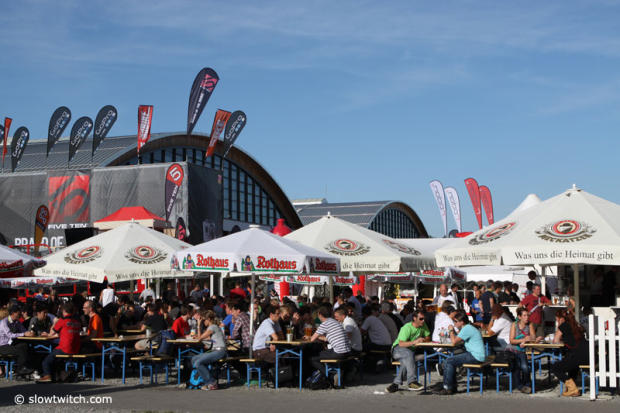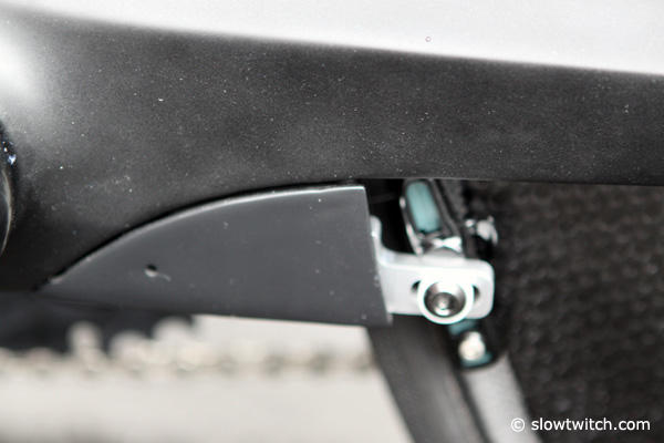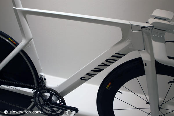 The bike was designed with the Omega Pharma Pro Tour team in mind and will apparently be available in 3 sizes – small, medium and large. The bike we saw in Friedrichshafen was built around a 73 degree seat angle, but we were told that an additional 3 sizes are in the works with triathletes in mind. The bike we are featuring here has been somewhat under wraps at the show, with only the white puzzle test bike inside a glass showcase, but owner Roman Arnold let us spend a few minutes with the black stealth one.