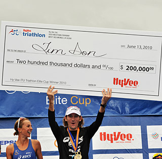 The sport of triathlon owes a debt of gratitude to Life Time Fitness CEO Bahram Akradi for pioneering half a million dollar purses for Olympic distance triathlons. Starting in 2002, the Life Time Fitness races showed the sincerest form of respect in its belief that its foremost practitioners were worthy of major league money. Not because they wanted to do triathlon a favor, but because the sport represented the values of his company – and would help sales. And now the sport owes an equal debt to Hy-Vee’s CEO Ric Jurgens for picking up torch that Akradi lit and carrying it forward with its million dollar purses for the Hy-Vee elite races. Equally important, Hy-Vee apparently is not being satisfied with a quick hit and run of publicity that comes with offering a big prize purse and is sticking with its affiliation for the long term.