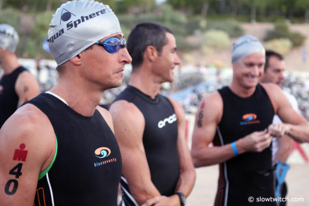 While Filip Ospaly looked quit serious at the swim start, Craig Alexander and Luke McKenzie are sharing a laugh.