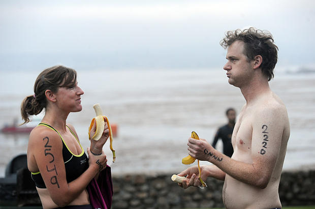 Two triathletes share a conversation and fuel up with bananas before the swim.