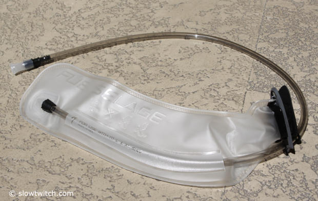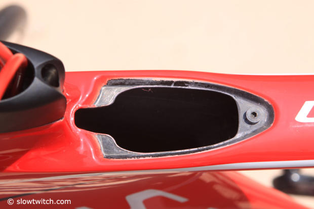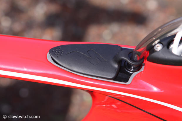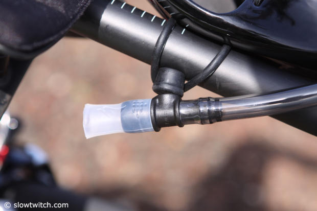 The massive downtube on the Shiv Tri hides a water reservoir that Specialized calls Fuelselage. This integrated hydration system hold approximately a regular water bottle amount in the smaller sizes and more in the bigger versions. The internal bladder is removable and can be refilled during the ride.