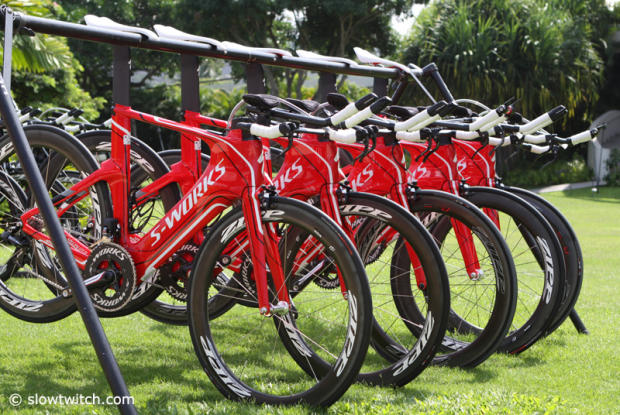 Several racks of Shiv Tri bikes awaited the media and the Specialized Pro team present in Kona.