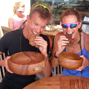 Sam: Well, the weeks preceding the Kona race we had pan-seared Ahi-tuna almost everyday. It is such a treat! I am addicted to fish, vegetables and fruits and I like to cook. Dark chocolate is also in the top-ranking of my most liked foods. I rarely eat meat.