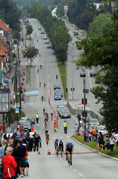 Bjorn Andersson rides past a statue of Antarctic explorer Roald Amundsen as he leads the field at Copenhagen.