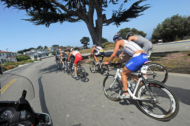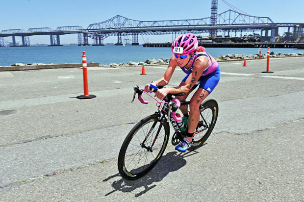 Flying on the steep downhill at the San Francisco Triathlon at Alcatraz.