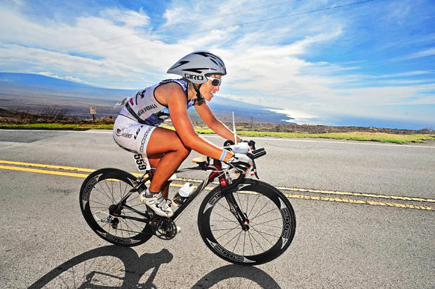 Fighting fierce winds, Amber Monforte crests the peak of the Kohala mountains s on her way to a second straight Ultraman victory.