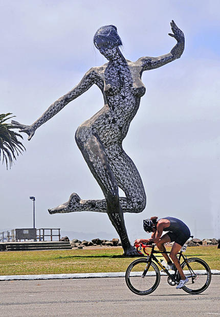 Riding past a giant sculpture of a dancing woman at Treasure Island.