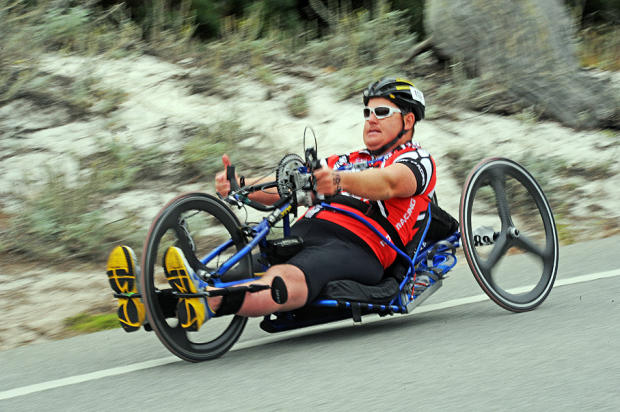 Physically Challenged competitor charges downhill at Pacific Grove.
