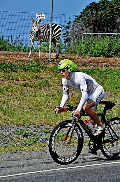 A roadside zebra is indifferent to Ultraman competitor Michael Coughlin riding by on Day One.