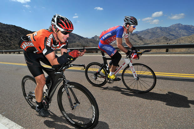 TJ Tollakson and Tim O’Donnell ride the Tucson area’s Mt Lemmon during a February workout.