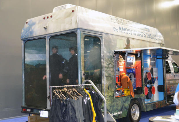 Lars Finanger and Brandon Marsh test out gear in the Gore Tex storm chamber.