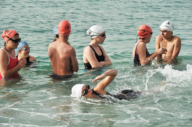 The young triathletes of Dubai (mostly children of European parents) get ready for a swim drill.