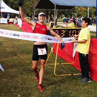 Ben: I had a strong start in the water and came out 3rd with an age grouper and another pro – Matthieu O’Halloran of Canada — who is a strong swimmer. I thought if I can get away on the start I’d be able to ride strong on this very difficult two-lap mountain bike course. I had a minute on Olivier Marceau but I had to stop halfway through the bike and had to change a flat and my lead decreased to 29 seconds. I used that to draw motivation and when I finished the second lap of bike I had increased my lead to 3 minutes. To be able to ride away from high class athlete like that was exhilarating. I have so much respect for Olivier — he’s done so much in triathlon I’d be stoked and a happy man if I could do half as much in my career. The Philippines course suited me — rocky, technical, lots of changes of elevation and I was able to ride well and come off bike with a 3 minute lead.