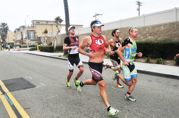 Paul Ambrose runs to 5th place past a local surfer on the Oceanside 70.3 course.