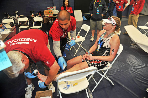 McQuaid's price of victory? A wicked blister taken care of in the post race medical room.