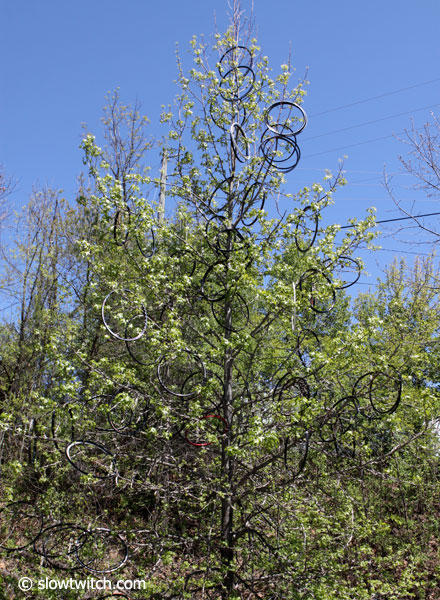 With a color full background of hubs and spokes nearby, Ted Quevedo trues up a wheel with great focus.