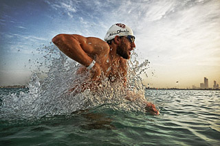 Faris Al-Sultan emerging from the water with epic power during pre race practice at Abu Dhabi; an artfully blurred action shot of Christian Brader's madly spinning rear wheel at Ingolstadt; a silhouette of a runner backlit by bright twilight clouds at Fuerteventura; bikers climbing up a massive seaside hill at Lanzarote; Natascha Badmann riding past primal lava rocks under a foreboding sky at Lanzarote; a runner looking up at a landing jet in the last mile at Lanzarote; a close-up of the rear tire of a rider charging up cobblestones at Frankfurt; a close-up silhouette of competitors emerging from the Kona swim; a wide angle shot dominated by primal lava in the foreground as an antlike competitor rides the Queen K far in the background; isolated by a telephoto lens, Mike Aigroz hungrily gulping water – and another of Andreas Raelert dousing his cap with two cups of water; two wide-angle, black and white shots of happy and exhausted finishers at the Kona finish line; and an intense telephoto of wheelchair competitor Geoffrey Kennedy.