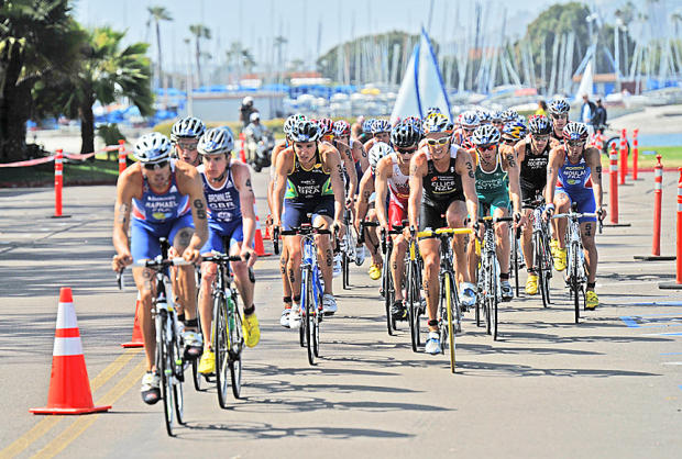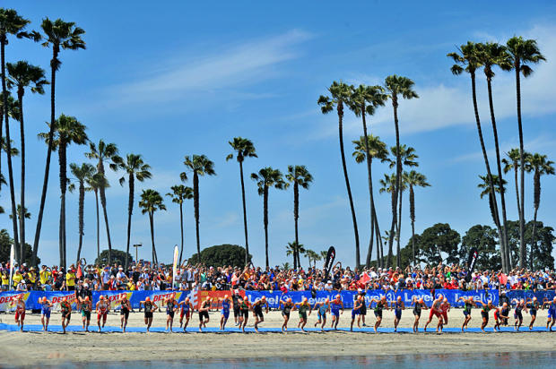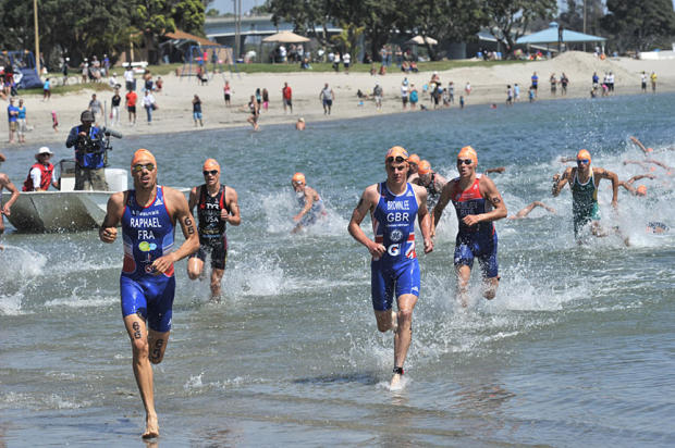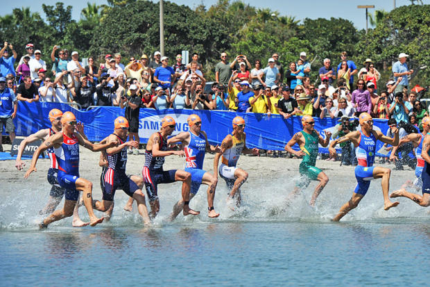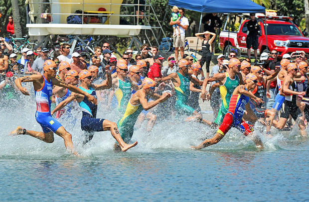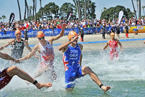 2000 Olympic gold medalist Simon Whitfield of Canada charges into the swim and ended up with an 11th place finish.