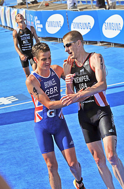 Winner Jonathan Brownlee congratulates Hunter Kemper for making his fourth Olympic team.