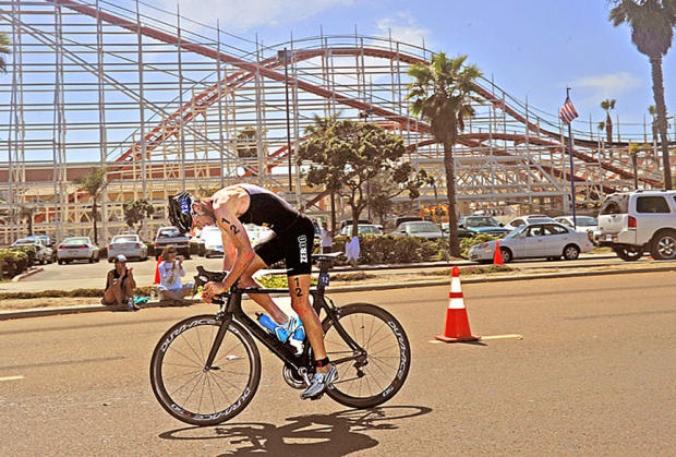 Kris Gemmell of New Zealand charges past the Mission Beach rollercoaster.