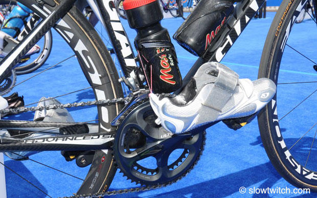 Jenkins has Shimano Ultegra derailleurs, cranks and pedals with Giro Facet tri shoes.
