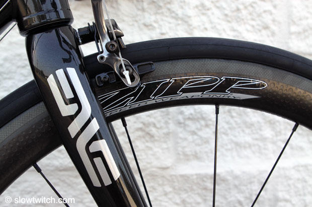 Up front an ENVE fork, Zipp Firecrest 303 wheel and SRAM Red front brake.