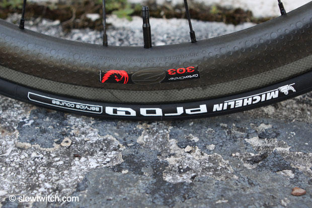 Michelin PRO 4 Service Course tires are mounted to the Zipp Firecrest 303 wheel.