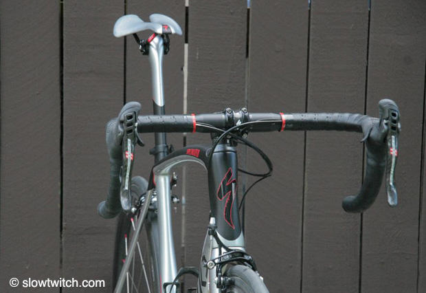 Campagnolo Super Record shift/brake levers are mounted to S-Works Tarmac carbon bars and an S-Works ProSet stem.
