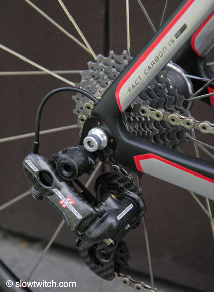 A closer look at the Campagnolo Super Record EPS rear derailleur.