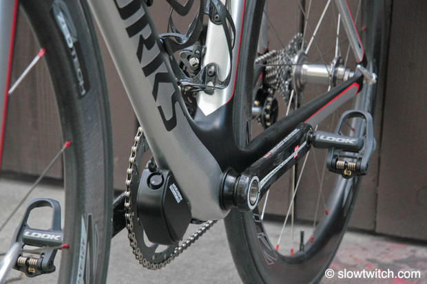 The underside of the Venge with the Campagnolo EPS power unit mounted.