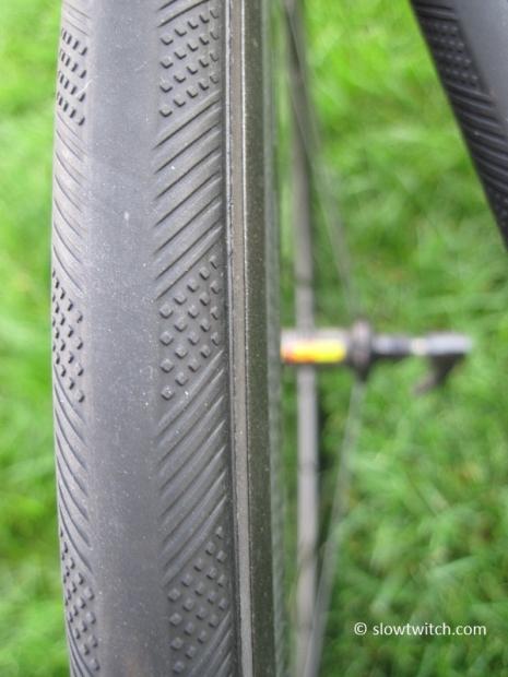 All-new tires: Mavic Yksion CXR GripLink front and PowerLink rear. 240 grams per tire, 210 TPI casing, 23mm cross section, nylon antipuncture breaker. Zack from Mavic tells me that “The tread pattern is not an accident.”