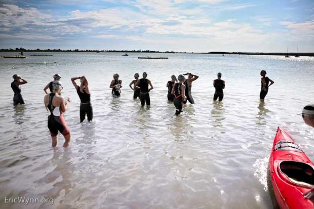 Dye emerged from the Boulder Reservoir tied with Marcus Fernandes of Brazil, 5 seconds back of Kiwi Dylan McNeice's race-best 17:52 swim, and two seconds behind Australian Joseph Lampe. Trailing the lead group were Kris Gemmell of New Zealand (18:10) Michael Fox of Australia (18:32) Matt Reed of the US (18:33) and, in a later amateur elite wave, Drew Scott (18:59).