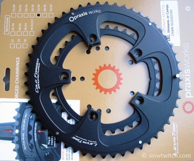 What are your size options? As of this writing, Praxis offers road rings in 53/39 for standard 130 BCD cranks, and 52/36, 50/36, and 50/34 for compact 110 BCD cranks. All are said to be compatible with 9, 10, and 11-speed chains (although they do not offer anything in Campagnolo’s proprietary 135mm BCD – so you’d have to run a non-Campy crank to use these rings). They also offer a host of cyclocross and mountain bike sizes, but, they unfortunately do not currently offer anything in the big kid range of 54-56 teeth. Keep in mind that Praxis rings do not work with the new 2012 SRAM Red crank – the design of this crank rotates the rings 180 degrees from the normal position, which would leave the pickup pin exposed if you attempted to mount a Praxis chainring.