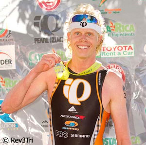 Cunningham combined a 7th-best 26:16 swim, 2nd-best 2:18:42 bike and a race-best 1:13:15 half marathon run to earn his third Rev3 half Ironman distance title in 2012 after victories at Quassy and Portland.