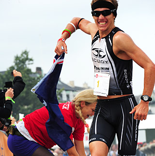 Two time defending champion Tim Berkel of Australia was in close contention as his 3rd-best 48:58 swim and 2nd-best 4:34:12 bike split left him in 2nd place and 9:12 back at T2 – well within range of a three-peat if he had managed his usual run. But Berkel was afflicted with some ailment and could only manage an uncharacteristically slow 3:41 marathon to finish 21st in 9:07:43.