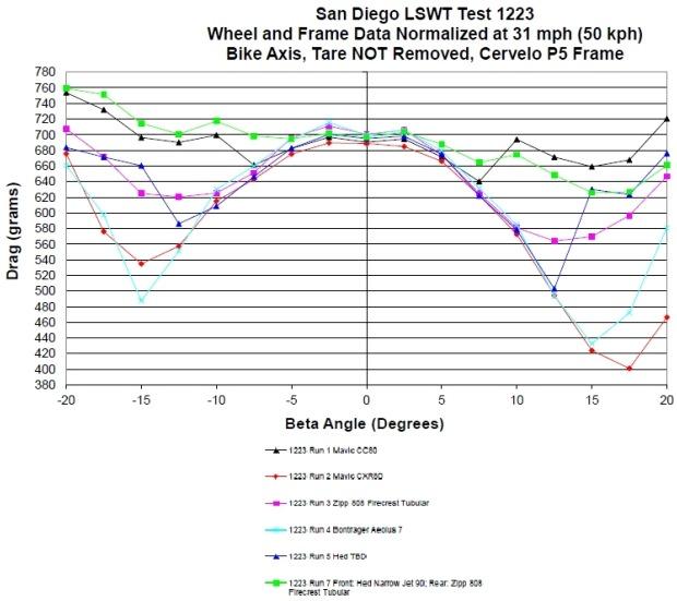 As you can see, it was a close battle, especially from zero to ten degrees. At zero, everything looks about the same. At ten, the delta between the fastest and slowest wheel is about 100 grams of drag.