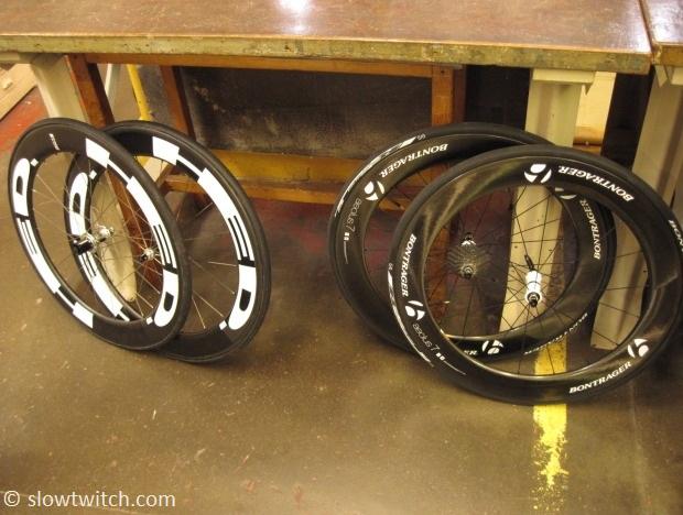 5. HED Jet 90 (narrower rim from ~4-5 years ago) front with Conti Supersonic 20mm clincher tire; used with Zipp 808 Firecrest tubular from above on the rear of the bike